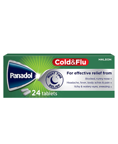 Panadol Cold & Flu is a White capsule-shaped tablet that contains Paracetamol which is Analgesic and Antipyretic, Pseudoephedrine which is an indirect acting sympathomimetic amine and Chlorpheniramine Maleate which is a potent antihistaminic.